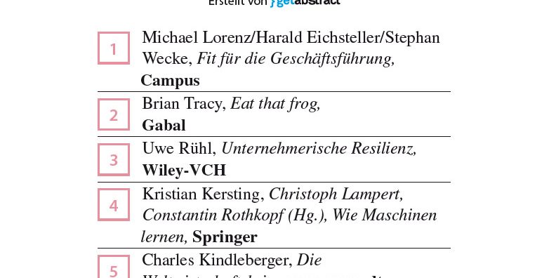 „Fit für die Geschäftsführung“ als Longseller in der 4. Auflage beim CAMPUS Verlag Frankfurt/New York hat es im April 2020 erstmals auf Platz 1 der Bestsellerliste von }getabstract im Bereich Businessbücher geschafft. Kurz zuvor war das neue Buch „Fit für die Geschäftsführung im digitalen Zeitalter“ von 5 Sterne Redner und Digitalexperte Prof. Harald Eichsteller und seinem Co-Autor Michael Lorenz auf der Online-Plattform Blinklist zum Buch der Woche gekürt worden.